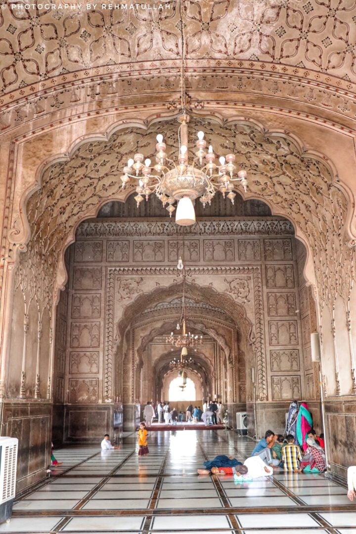 The 50’6″ main prayer hall is made up of top-notch red sandstone covered with meticulously structured white marble. Sang-i-Abri is also used in its construction. This height is kept to augment the ventilation system and meditation power of the hall. The prayer chamber comprises 6 niches. Out of the 6, 5 niches surround the central arc-shaped niche. Mughal floral frescoes on the ceiling never fail to remind worshippers of the glorious Mughal era in the subcontinent.
