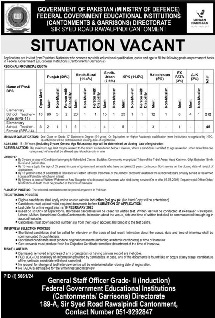 The Federal Government Educational Institutions (FGEI), under the auspices of the Ministry of Defence, has announced a range of job opportunities available for competent Pakistani nationals eager to serve in various educational roles within the Cantonments and Garrisons Directorate. These positions are being offered on a permanent basis, ensuring job security and a stable career path for the successful candidates. The FGEI is known for its commitment to educational excellence and is seeking individuals who can contribute to the academic growth and development of its students.