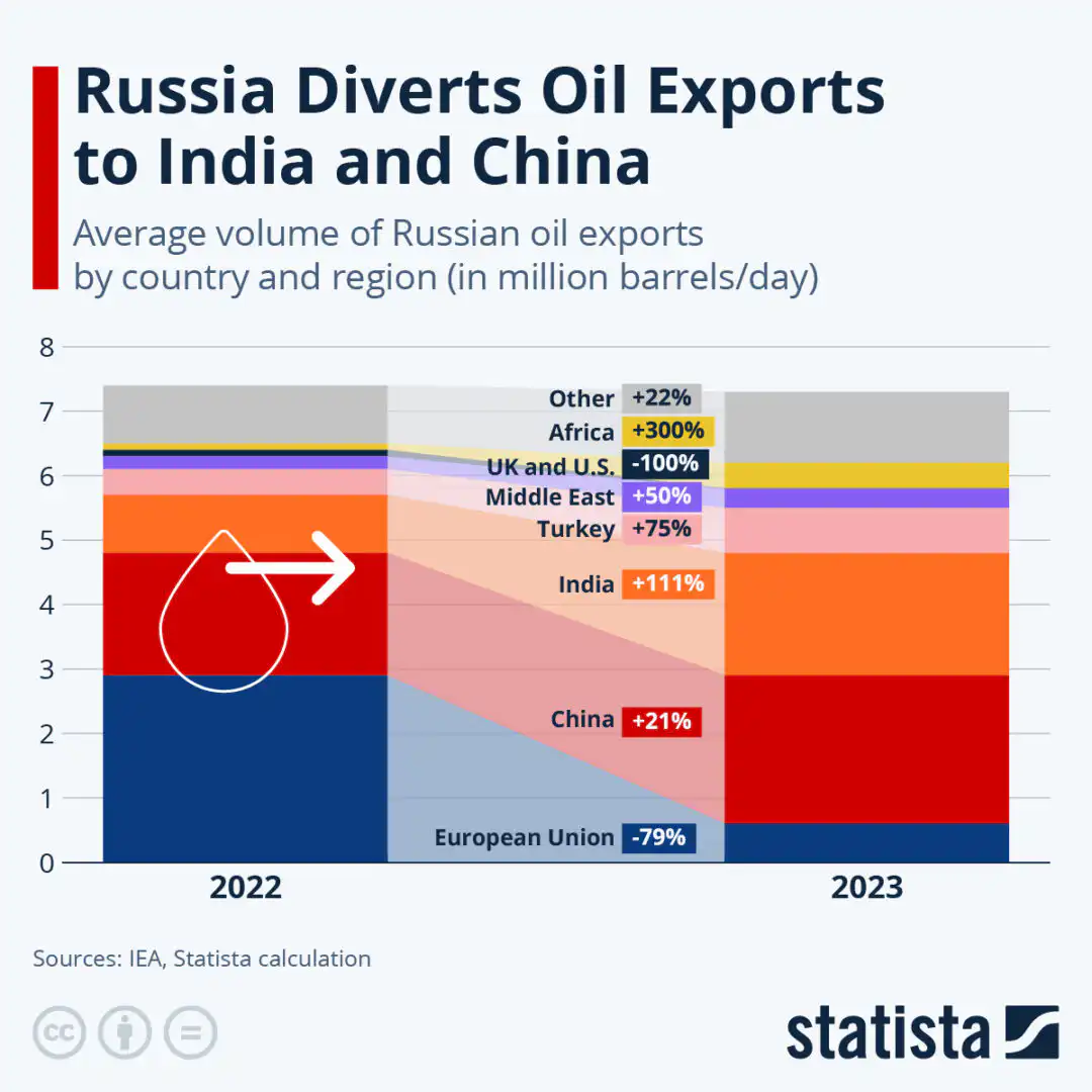 Russia’s major revenue come from energy exports i.e. oil and natural gas. Despite facing US sanctions, no major blow occurred to Russia’s government in terms of its exports. These exports have rather increased and are even projected to further increase in 2024 by 14% and 7% for LNG and pipeline exports respectively. This growth is largely due to the fact that India and China are now the major importers of Russian oil and gas. In 2022, China and India’s imports were 1.9 million barrels per day (mb/d) and 0.9 mb/d respectively. By 2023, China’s exports increased to 2.3 mb/d and India’s to 1.9 mb/d.