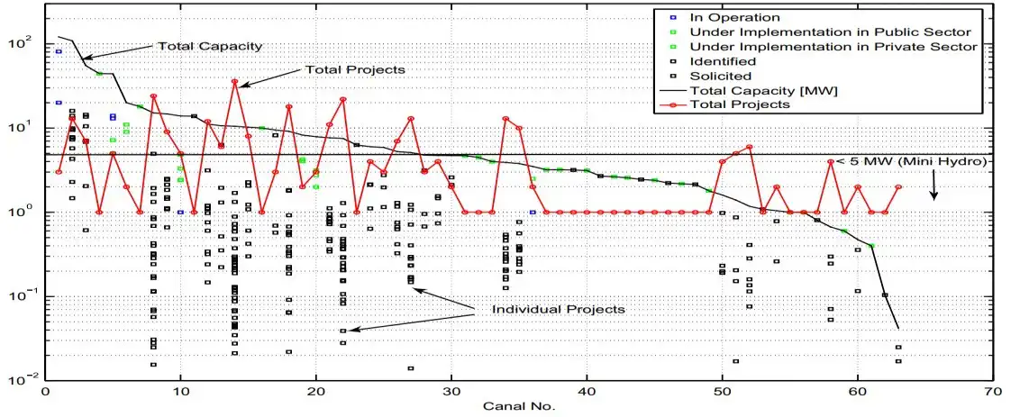 The bulk of projects that are possible on canals fall into the category of MHPs, as shown in the figure above. The figure above also shows that although the canals possess significant potential for MHPs, only a small percentage of them are being harnessed, with the majority remaining untapped, posing a fantastic opportunity to cultivate energy production and by extension, the livelihood of people.