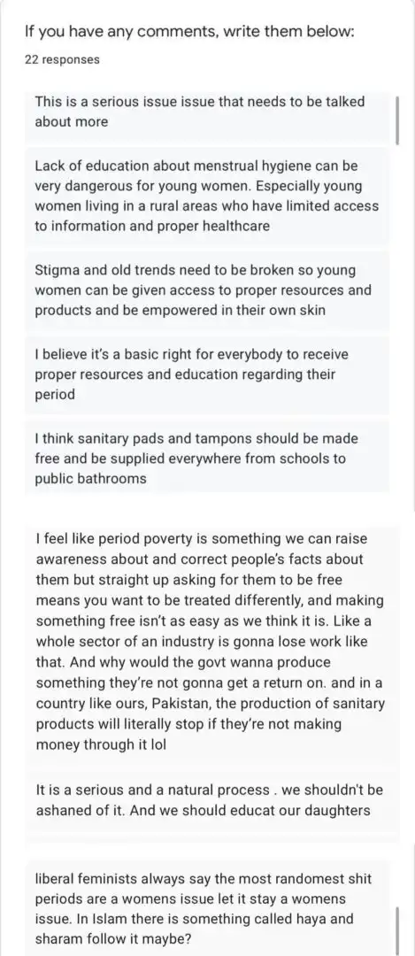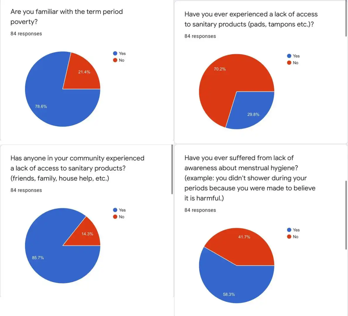 In order to investigate the impact of period poverty on women, a short survey, created on google forms, consisting of 9 quantitative response questions and one open-ended question to collect qualitative responses, was sent out to people who menstruate using various online platforms.