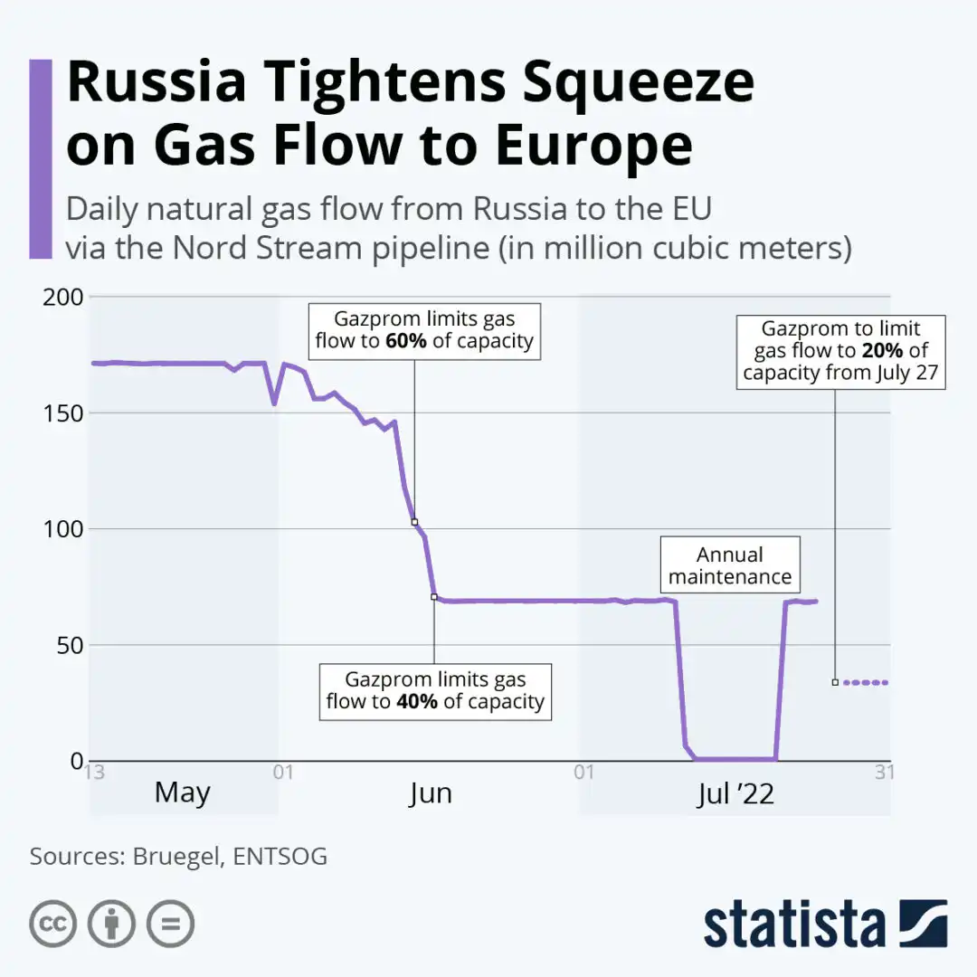 Russia is currently supplying 15% of Europe’s natural gas, far below the pre-war levels. Moscow’s most recent announcement has further fuelled the fears of a complete Russian gas shutoff, wreaking economic and political havoc in the coming winter in Europe. Ahead of Moscow’s announcement, European Commission President Ursula von der Leyen emphasised Europe needs to be ready whether it’s a partial, major, or complete cut-off of Russian gas.