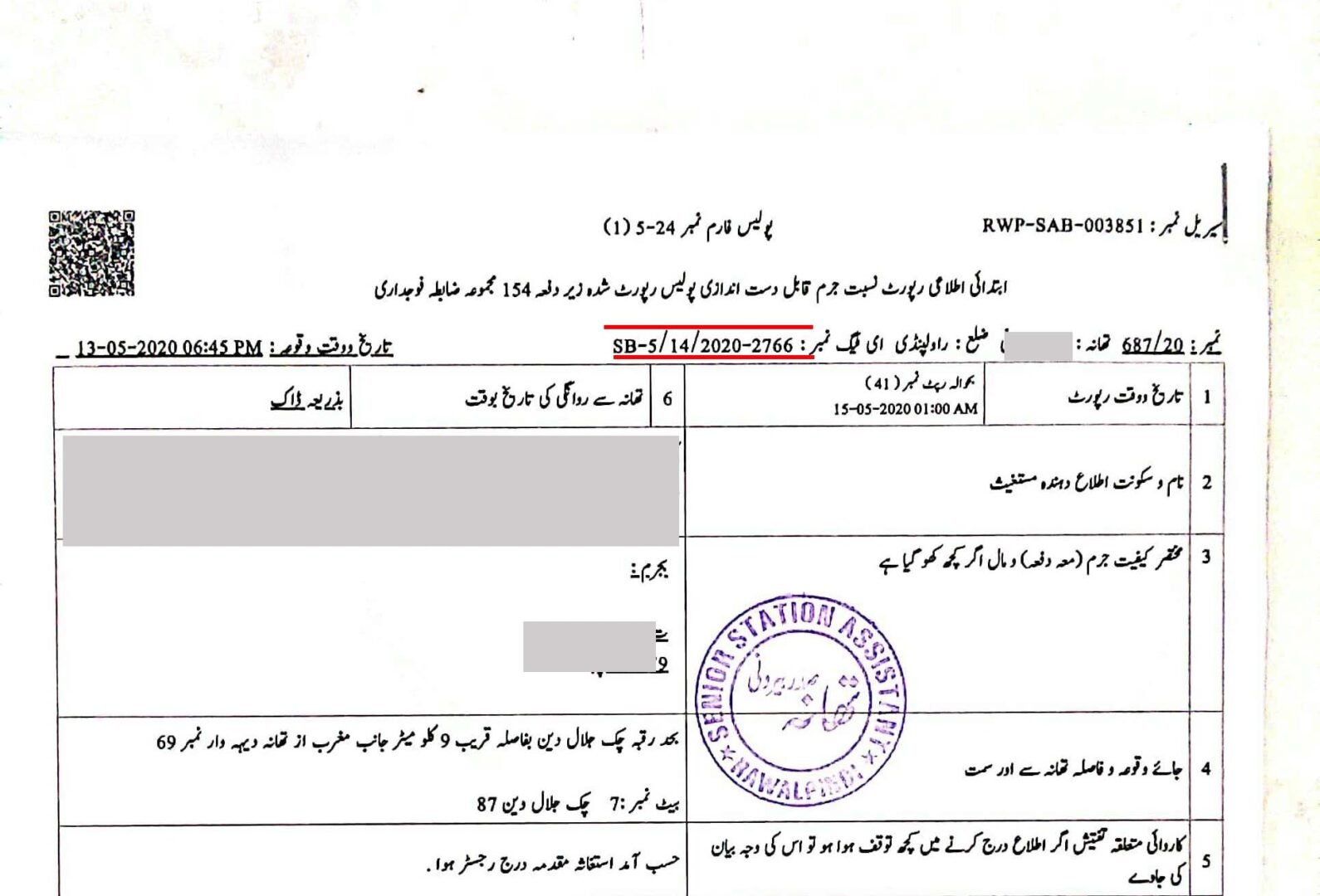 An FIR is registered under section 154 of the Code of Criminal Procedure, 1898 (Cr.P.C.) of Pakistan which under the head “Information in cognizable cases” states that “information regarding the commission of a cognizable offence given to an officer in charge of the station shall be reduced to writing by him. It continues as the written substance of information shall be read to the informant and his signature will be taken on the paper. Then, this substance of information shall be entered in a book kept by the officer.”